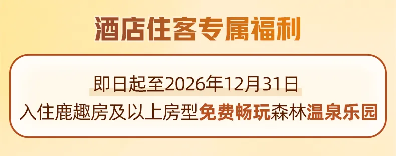 预订鹿趣房且入住首日为2026年12月31日及之前的住客,在入住期间可免费畅玩森林温泉乐园(双人套票赠送2张,三人套票赠送3张)。