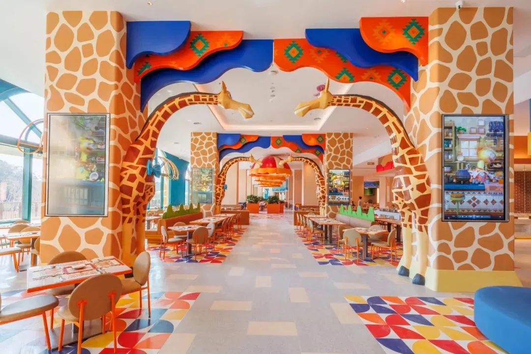 全日制餐厅,长隆首创的长颈鹿主题沉浸式多国籍料理餐厅,东南亚系、日系、传统中式、岭南风味美食,在这里你都能一站品尝到。整个餐厅都是慢慢的长颈鹿家族元素,童话感满满。